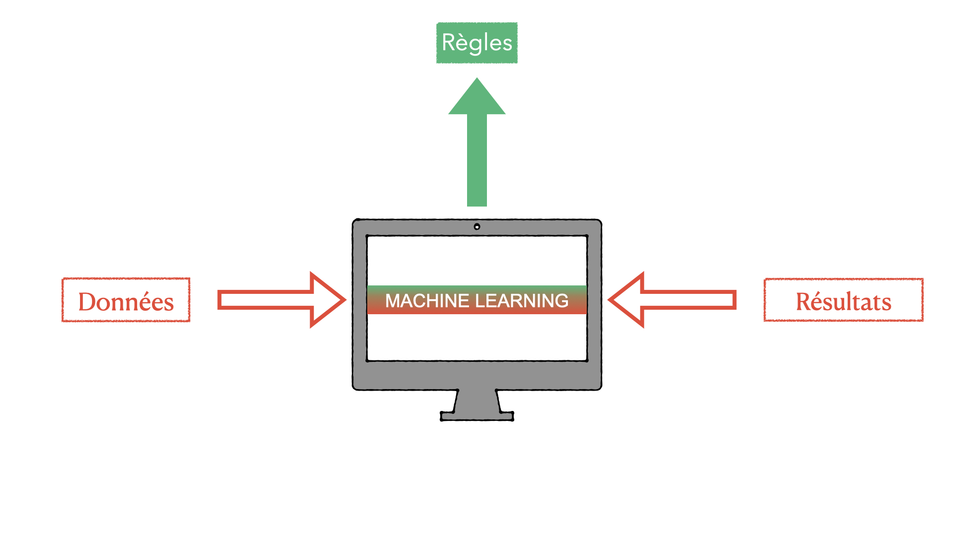 La machine va être nourrie par des données et des règles vont être édictées pour qu’elle traite les données correctement. Il est aussi possible de fournir à l’ordinateur les données ainsi que les résultats pour qu’il déduise des règles. Cela se traduit par 4 éléments à fournir: des entrées, des poids/coefficients, un seuil décisionnel et une sortie.